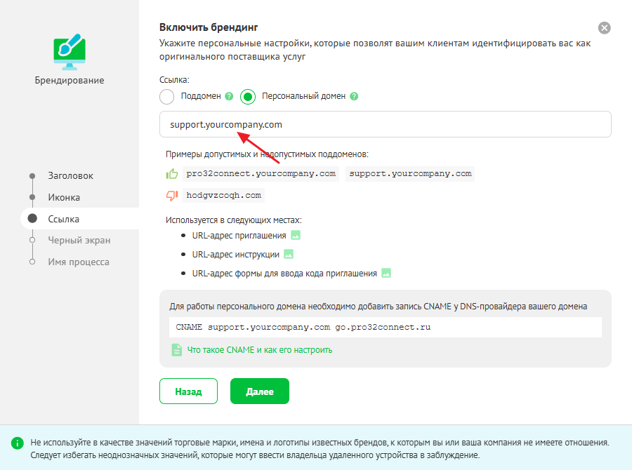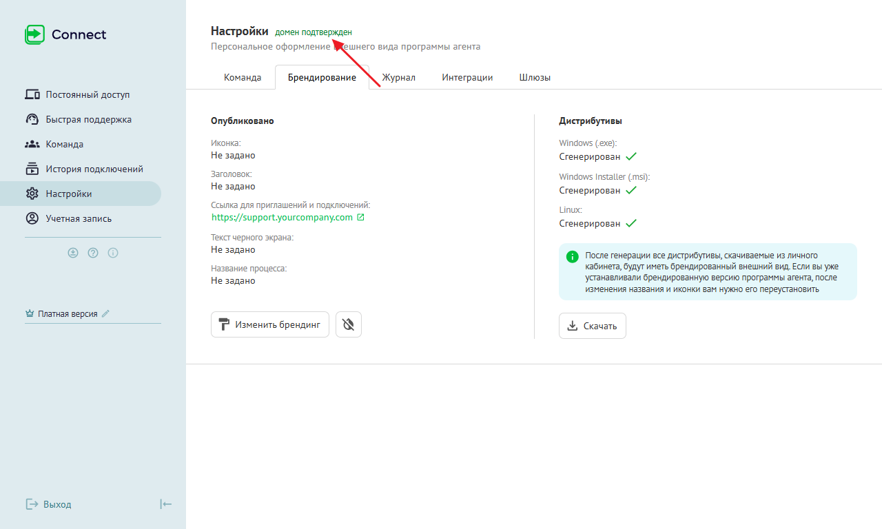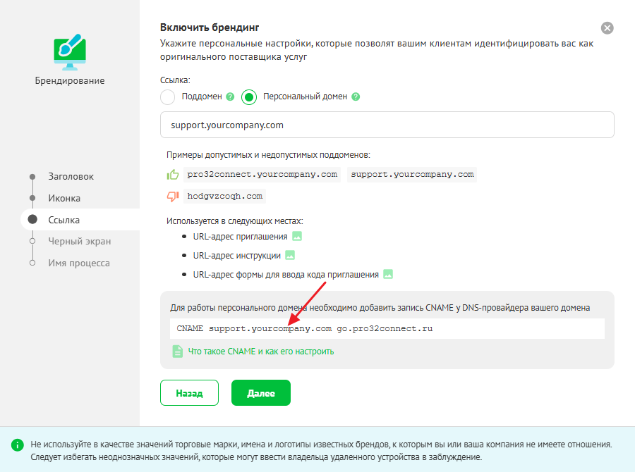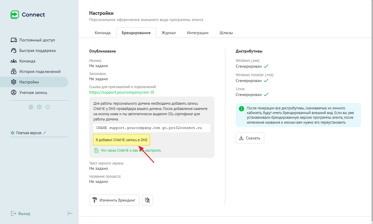 CNAMEв панели управления вашим доменом. - Подтвердите настройку в разделе Настройки брендирования вашего личного кабинета.
