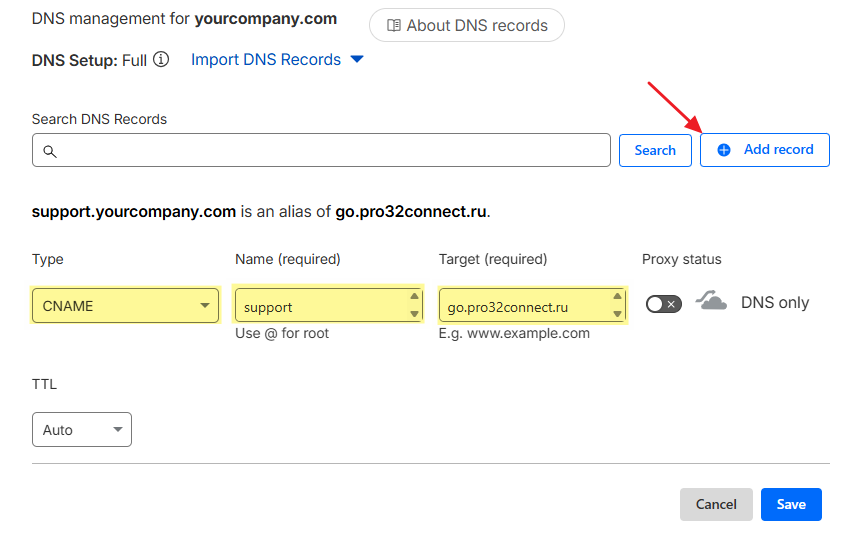 Вот как будет выглядеть запись CNAME support.yourcompany.com go.pro32connect.ru в виде таблицы: