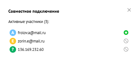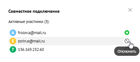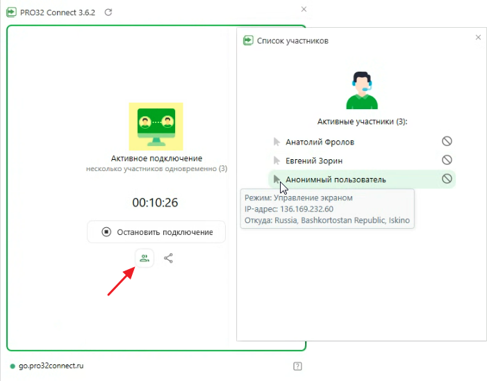 Когда новый специалист присоединяется к сеансу, другие участники увидят уведомление в окне подключения, а в панели управления появится кнопка для управления участниками:
