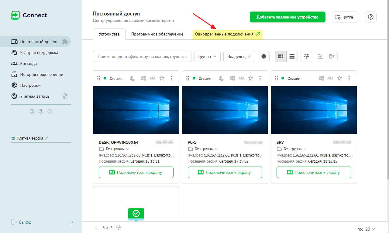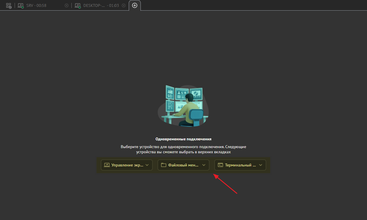 Одновременное подключение - это несколько параллельных подключений, установленных одним специалистом к разным удалённым устройствам. Такие подключения особенно важны при обслуживании корпоративных сред, где данные хранятся на нескольких устройствах, но к ним нужно иметь доступ и управлять ими одновременно.