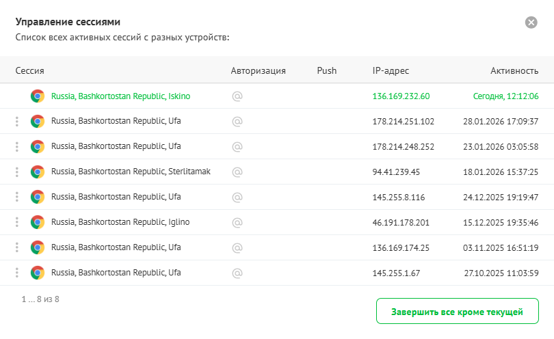 Техник может быть одновременно авторизован в нескольких браузерах или на нескольких устройствах. Вы можете просмотреть список активных сеансов в разделе Учетная запись → Безопасность, нажав Управлять сессиями в блоке Активные сессии. Откроется окно, в котором отображаются все активные входы в ваш аккаунт: