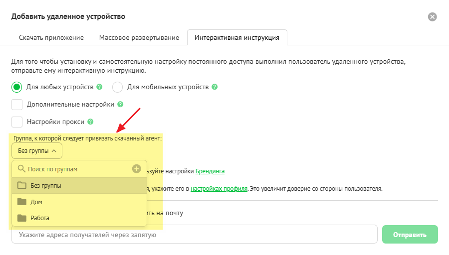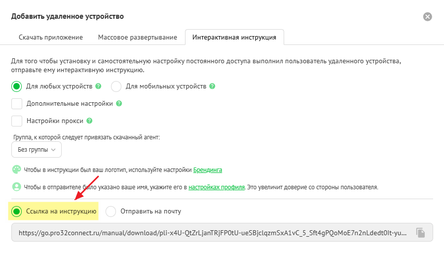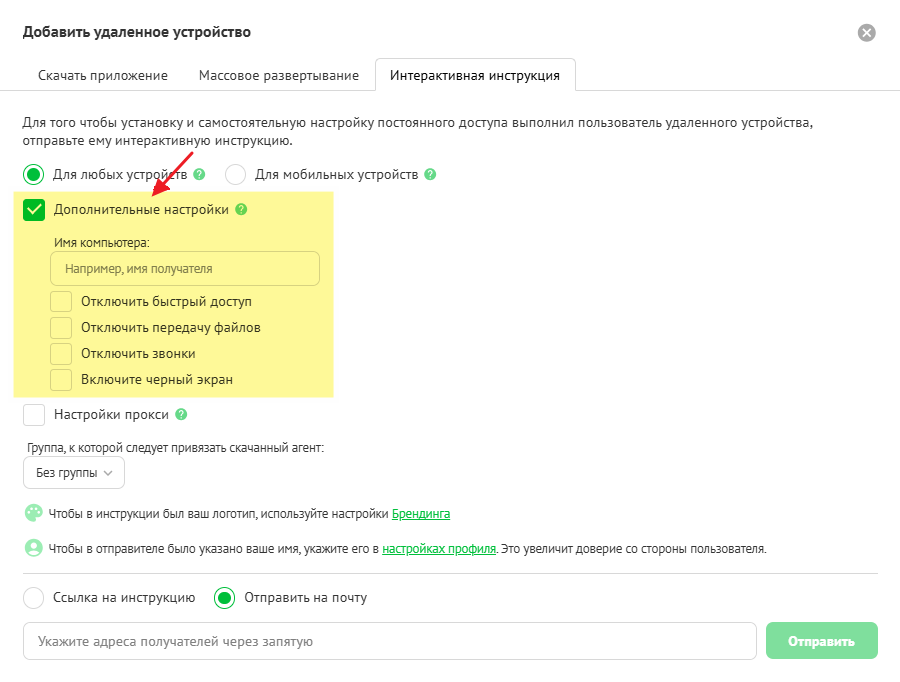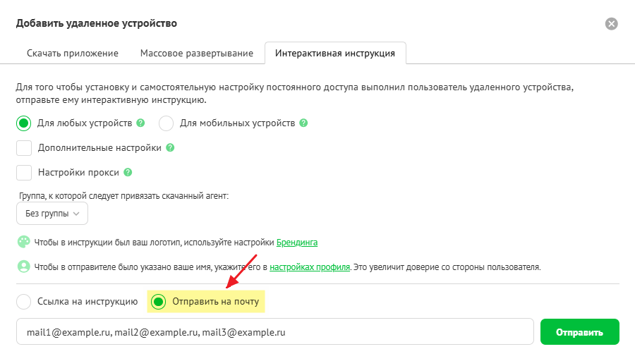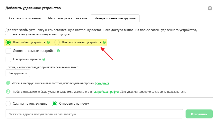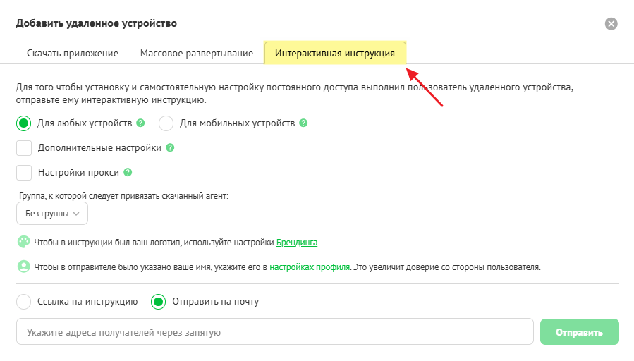 Чтобы начать настройку руководства, перейдите в раздел Постоянный доступ, откройте окно Добавить устройство и выберите вкладку Отправить инструкцию.