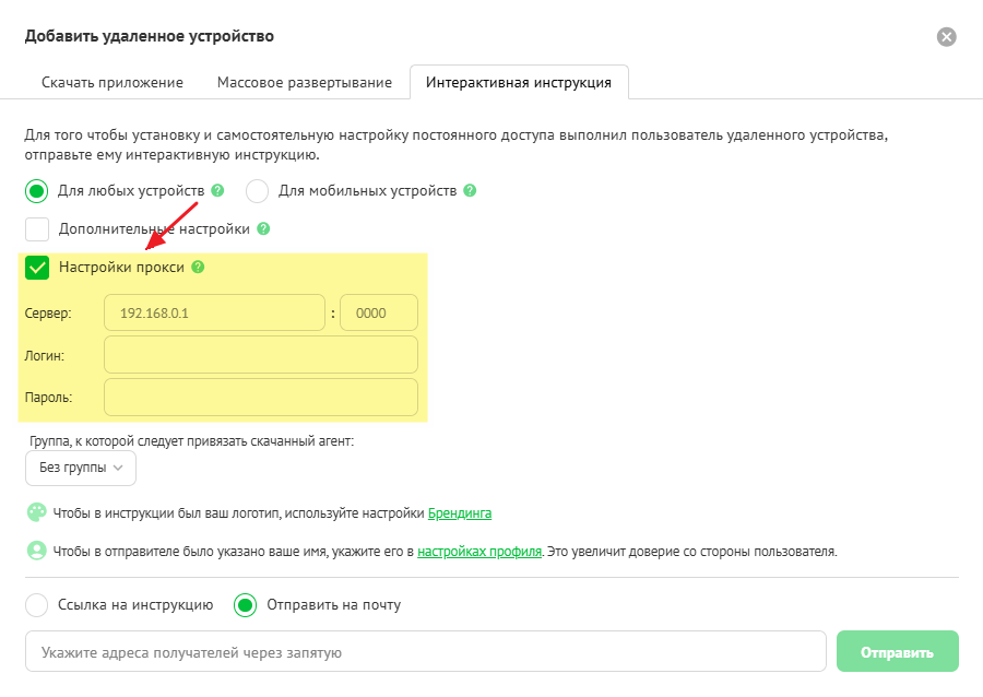 Если на стороне клиента используется прокси‑сервер, укажите его параметры (сервер, порт, логин и пароль). Они автоматически отобразятся в инструкции на стороне клиента.