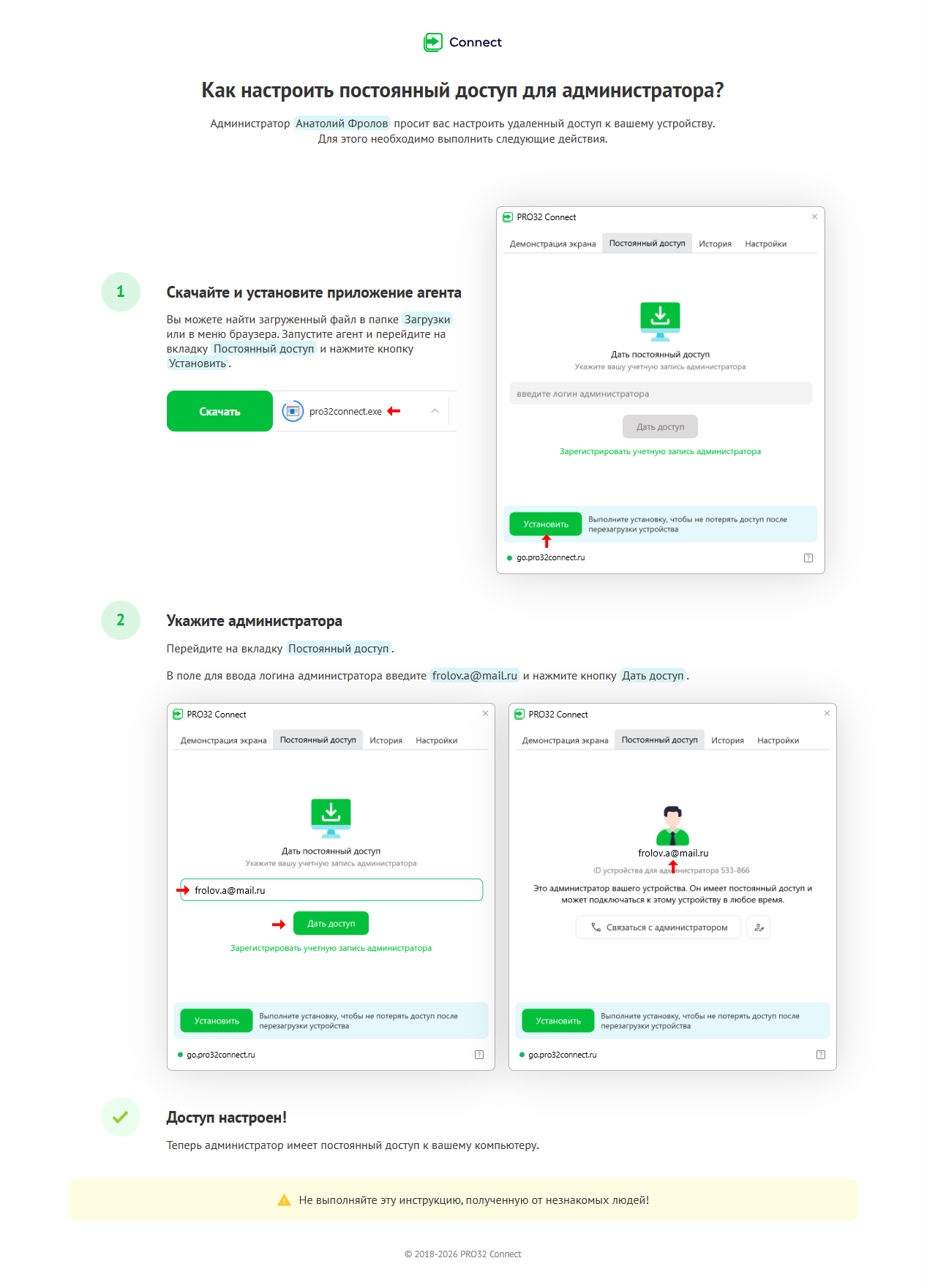 Настройка постоянного доступа предполагает, что пользователь может не разбираться в технологиях удалённого доступа. Чтобы ускорить процесс подключения, вы можете отправить пользователю автоматическую инструкцию по настройке Постоянного доступа.