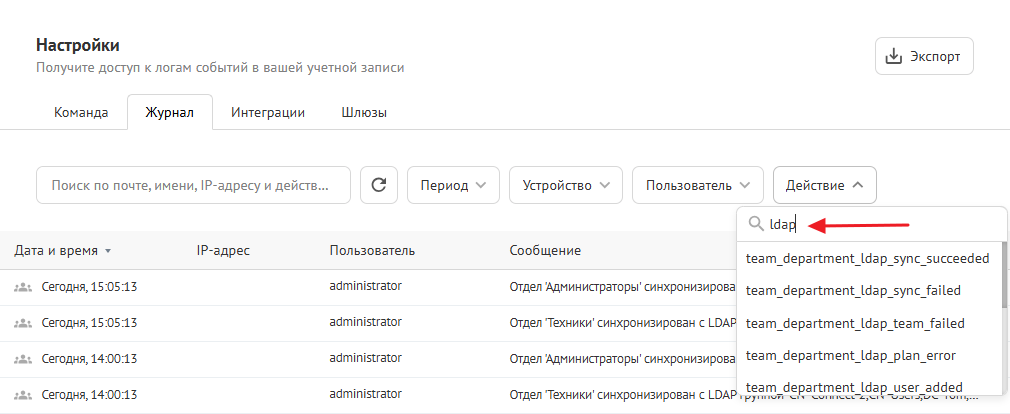 Все события интеграции со шлюзом можно найти в журнале событий. Используйте фильтрацию по префиксу team_department_ldap_*: