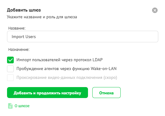 Во всплывающем окне введите имя шлюза, отметьте Импорт пользователей через протокол LDAP и нажмите Добавить и продолжить настройку: