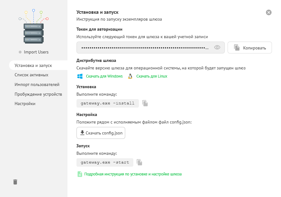 В config.json хранятся адрес сервера и токен, связывающий шлюз с вашим аккаунтом.