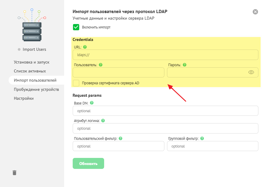 В карточке шлюза откройте вкладку Импорт пользователей, включите Включить импорт и укажите учетные данные для доступа к AD.