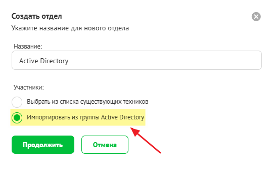 Для этого создайте отдел в разделе Команда. На вкладке Участники выберите Импортировать из группы Active Directory и укажите группу.