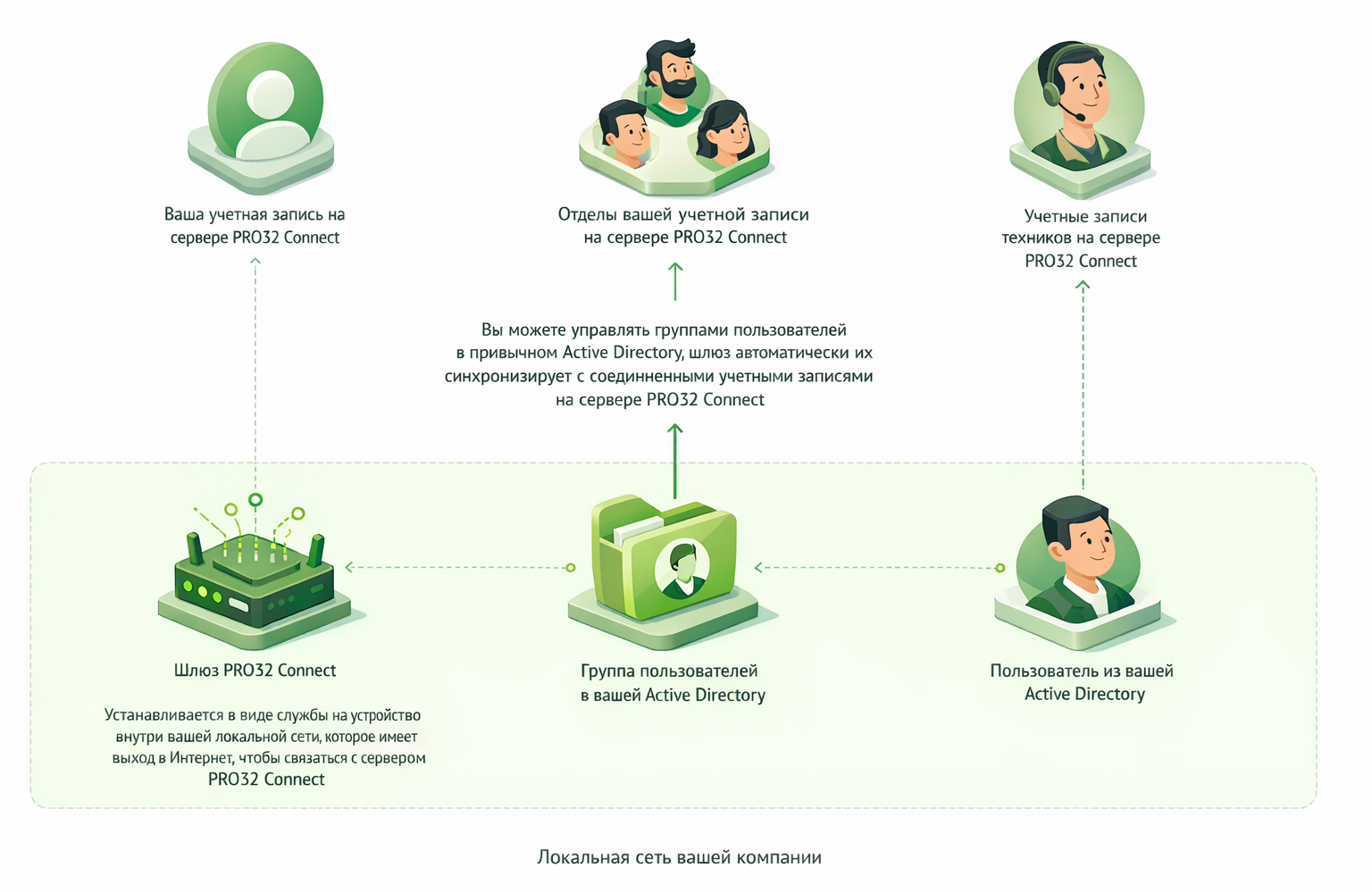 Для интеграции необходимо установить шлюз внутри вашей локальной сети и предоставить ей доступ к Active Directory (далее AD). Шлюз будет получать необходимые группы из AD и отправлять данные пользователей на сервер PRO32 Connect. После этого сервер добавит их в ваш аккаунт.
