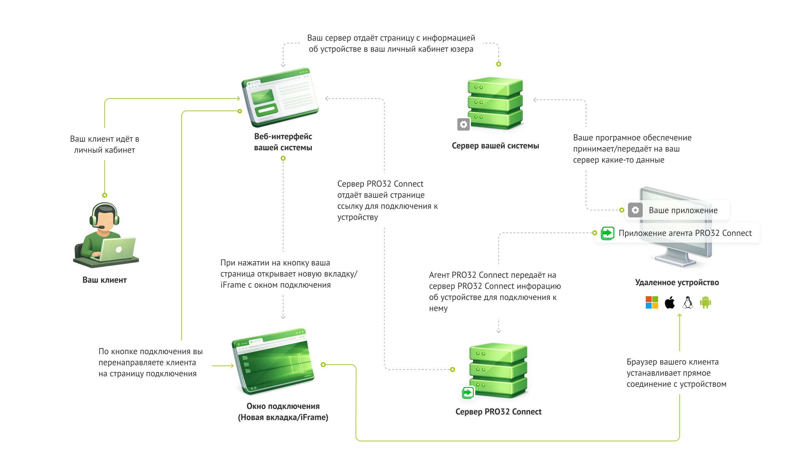 Чтобы включить удалённый доступ к устройствам, вам необходимо установить наш агент на устройства пользователей и привязать его к их аккаунтам в нашей системе. Затем вы можете получать ссылку для подключения через наш HTTP API и встроить её в интерфейс вашего сервиса. Работа происходит следующим образом: