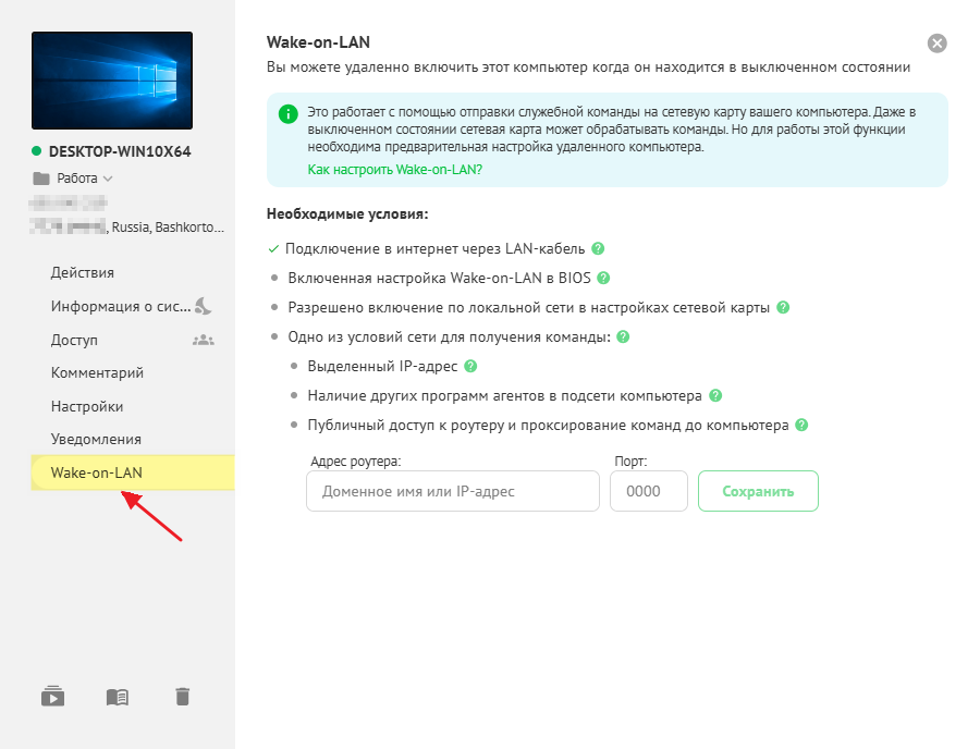 Вы можете включить удалённый компьютер с помощью технологии Wake-On-LAN, если устройство было предварительно настроено.