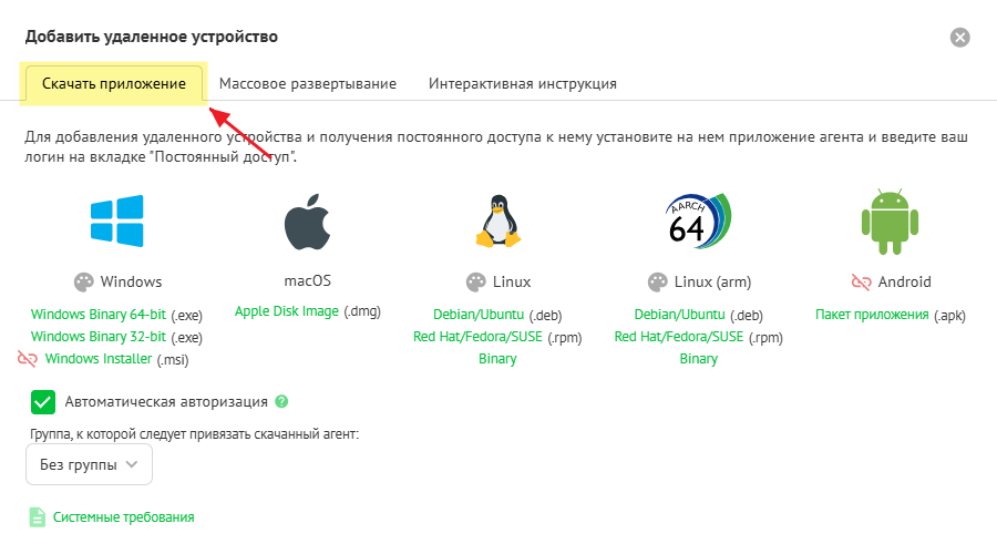 Вам необходимо загрузить и установить подходящую версию приложения агента на устройство, которым вы хотите управлять. Выберите версию в зависимости от операционной системы устройства. В настоящее время поддерживаются такие системы, как Windows, macOS, Linux и Android.