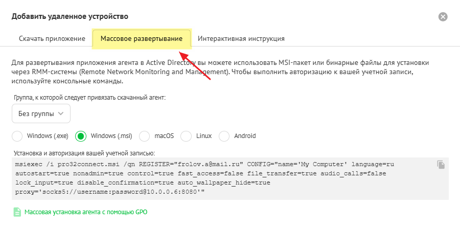 Подробнее о массовом развертывании агентов читайте в статье Установка агентов через GPO (массовое развертывание).