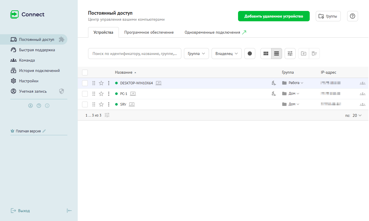 Чтобы подключиться к устройствам, перейдите в раздел Постоянный доступ и нажмите кнопку подключения прямо из списка, либо из карточки устройства: