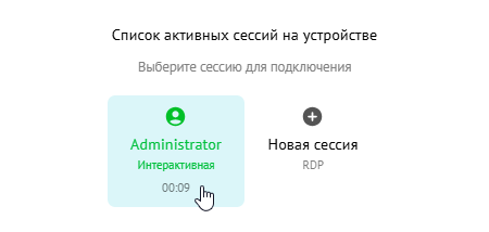 При подключении к устройству могут уже работать существующие сессии ОС: интерактивная сессия или RDP-сессия. В этом случае появится окно выбора, позволяющее выбрать, какую сессию использовать для удалённого подключения. Если выбор не будет сделан в течение 30 секунд и интерактивная сессия уже активна на устройстве, она будет выбрана автоматически по умолчанию.