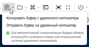 Вы можете обмениваться данными буфера обмена между удалённым и локальным устройством с помощью ручных команд Копировать буфер обмена с удалённого рабочего стола и Отправить буфер обмена на удалённый рабочий стол.