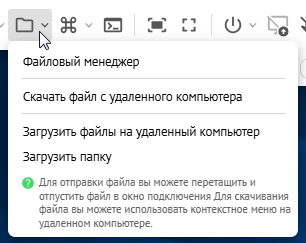 Вы можете передавать файлы между локальным и удалённым устройством. Можно загружать и скачивать отдельные файлы или папки, а также открывать параллельную сессию в режиме Файловый менеджер.