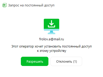 Эта функция полезна при подключении по приглашению Быстрая поддержка и необходимости постоянного доступа к устройству. После нажатия кнопки запроса на удалённом устройстве появится окно подтверждения: