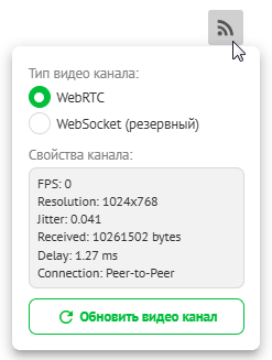 Также возможно переключать канал передачи данных между WebRTC и WebSocket и обновлять видеопоток.