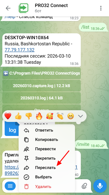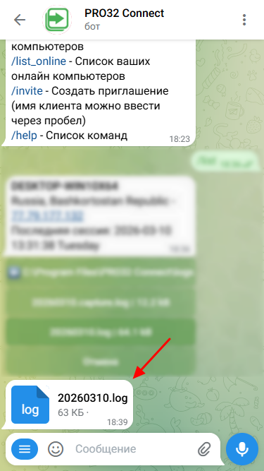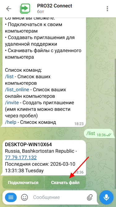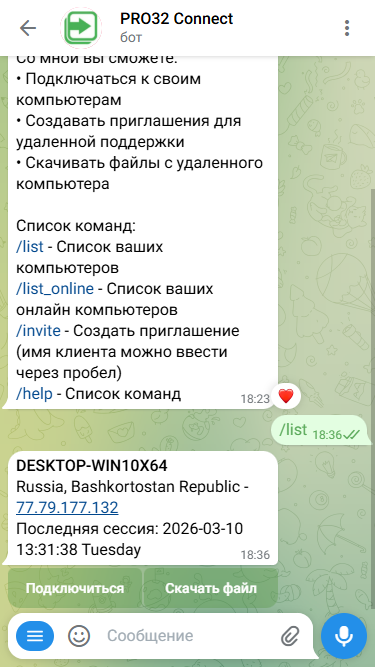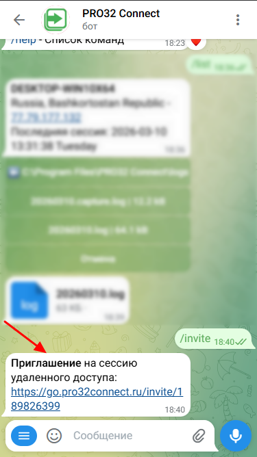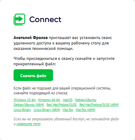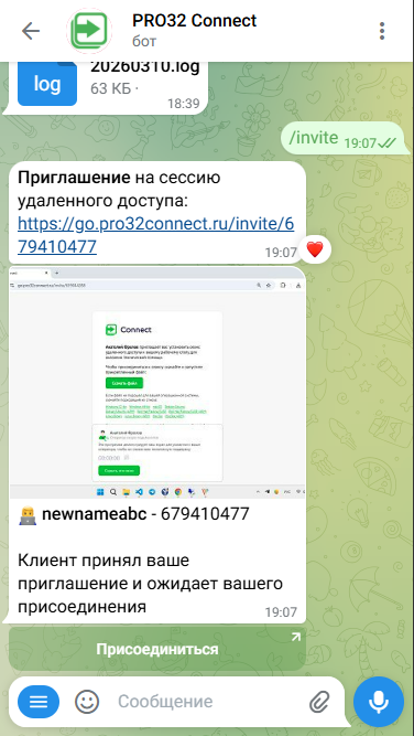 После того как пользователь примет приглашение (запустит файл агента), бот отправит вам уведомление со ссылкой для подключения к сессии.