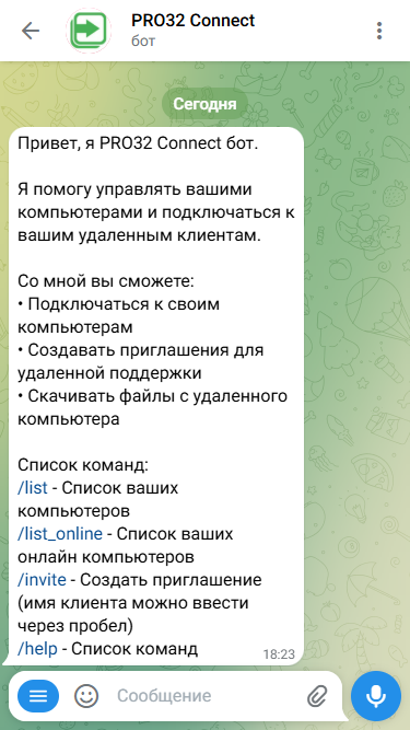 Для этого нужно подключить бота и привязать его к вашему аккаунту PRO32 Connect: