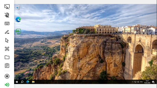 После нажатия Подключиться генерируется одноразовая ссылка для подключения, по которой необходимо перейти. Два клика могут показаться неудобными, но это сделано в целях безопасности. После перехода по ссылке откроется веб-страница с изображением удалённого рабочего стола и функциями управления.