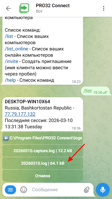 Чтобы подключиться к рабочему столу, выполните команду /list — бот пришлёт список рабочих столов с постоянным доступом из вашего личного кабинета: